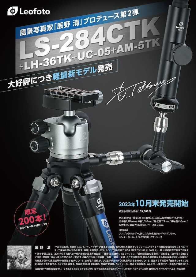 風景写真家・辰野清氏のプロデュースによる、絶景を撮るための三脚。 老若男女問わず使いやすい軽さに配慮。また、斜平地で立てた際に高さが 軽量で堅牢さを兼ね備えた風景撮影に必要な要素を取り入れたこだわりの仕様となっている。 ●型番:LS-284CTK+LH-36TK ●JAN:4573138037546 ●耐荷重量:10kg ●重量:1,840g (アンブレラホルダー+アームのみ:380g) ●全伸長:1,910mm ●伸長:1,590mm ●最低高:175mm ●収納高:630mm ●段数:4 ●脚最大径:28mm ●ベース径:53mm