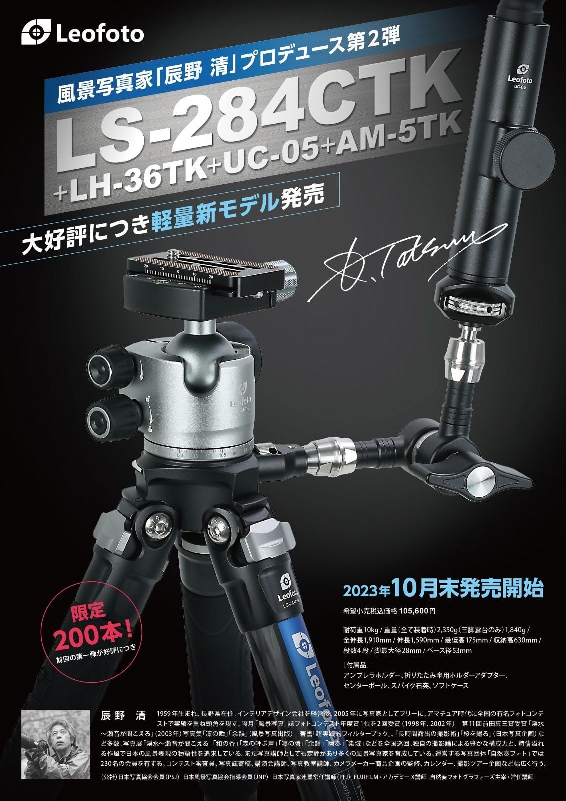 風景写真家・辰野清氏のプロデュースによる、絶景を撮るための三脚。 老若男女問わず使いやすい軽さに配慮。また、斜平地で立てた際に高さが 軽量で堅牢さを兼ね備えた風景撮影に必要な要素を取り入れたこだわりの仕様となっている。 付属の傘ホルダー(UC-05+AM-5TK)はスムーズな装着と揺れが極力出ない頑丈な軽量設計。また、強風時のシャッターブレや三脚転倒対策として傘を簡単に抜く事も出来、自由な駆動によりハレギリ用としても使用可能。 また、付属のBS-1折り畳み傘用ホルダーアダプターを使う事により、折り畳み傘にも対応。※お持ちの傘の持ち手が取り外せるかご確認ください。 ※持ち手がU字の雨傘を使う場合は、持ち手を切る必要がございます。風景写真家・辰野清の長年の経験をもとに作られた、こだわりの逸品となっている。