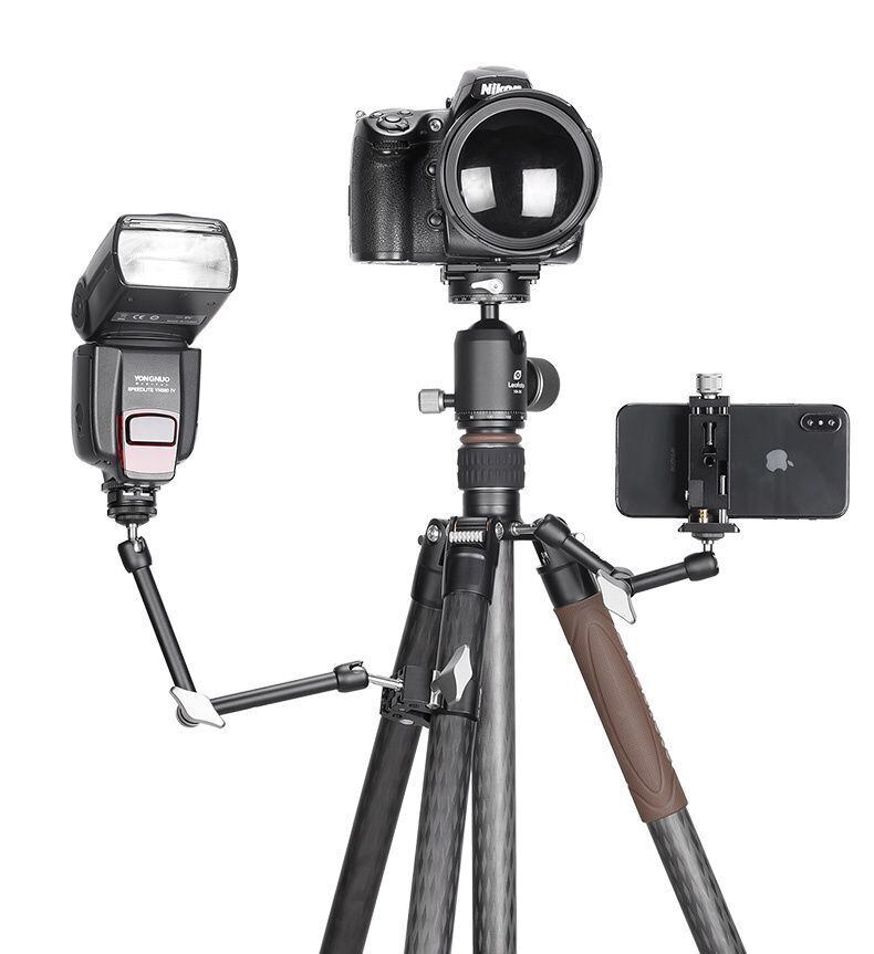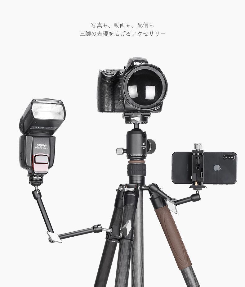 三脚に取り付けることで、スマートフォンや携帯ストロボなどの周辺機材を増設できる撮影アクセサリー。耐荷重3kg。
