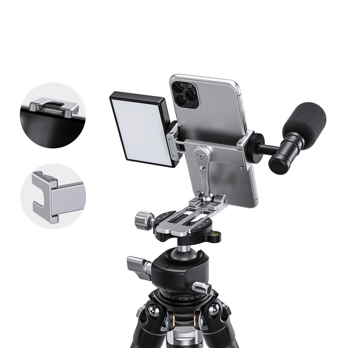自立可能なスマホ用スタンド。脚を畳めばアルカスタイル雲台にも取付可能