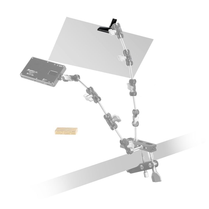 カメラ用のアームに取り付けられるネジ穴を備えたクリップ。撮影の小道具やレフ版などを固定できます。