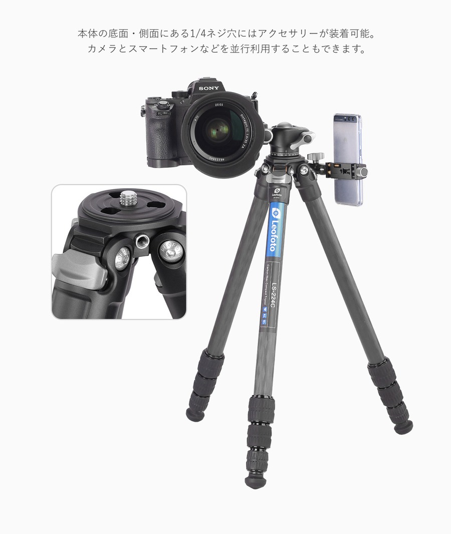 Leofotoカーボン三脚LS-224Cと自由雲台LH-25のセット レンジャーシリーズは軽量でコンパクトなサイズと堅牢さを兼ね備えたオールラウンダーな三脚です。旅行かばんの中にも入れられる収納時の大きさは街から山まであらゆるシーンで活躍します。